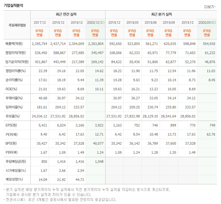 네이버 금융의 종목 검색창에서 삼성전자 또는 어떤 종목을 검색하던 다음과 같은 기업실적분석표를 볼 수 있습니다.